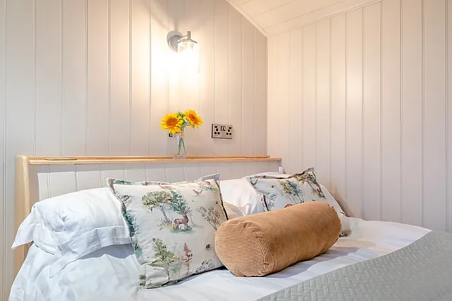 The accommodation features a comfortable double bed, providing a cosy sleeping arrangement for two guests within the charming open-plan shepherd's hut.