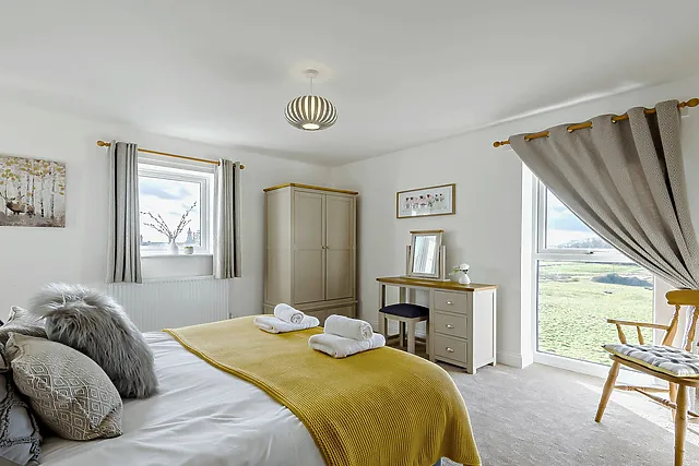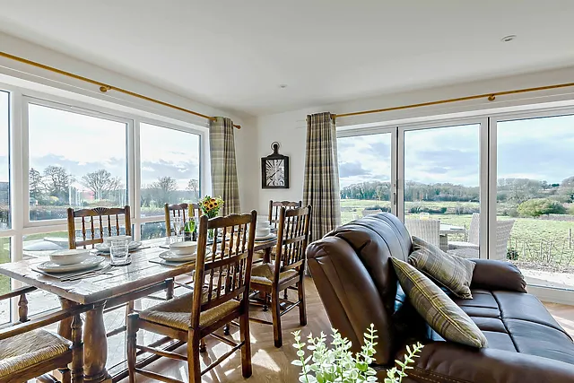 The property boasts a spacious open-plan living area with bi-fold doors that frame the picturesque rural views. A fully equipped kitchen and a cosy dining area make for perfect family or group meals. Step outside to find an inviting hot tub, where you can unwind and soak up the elevated countryside vistas.