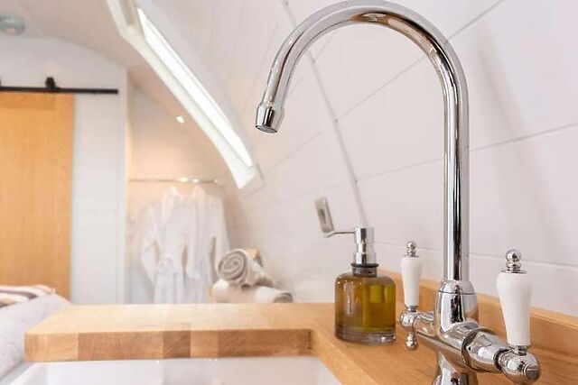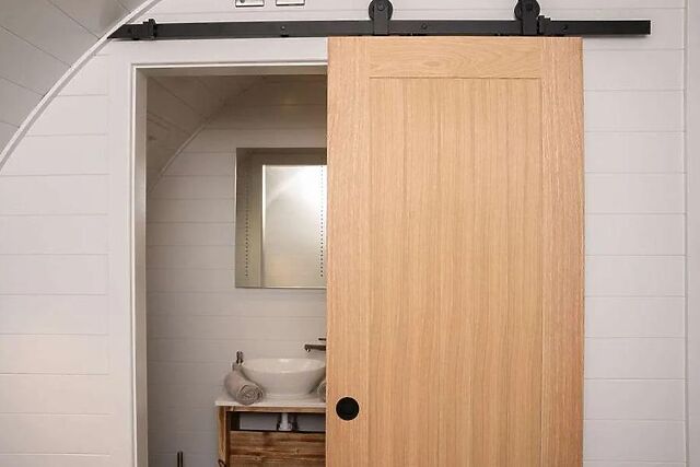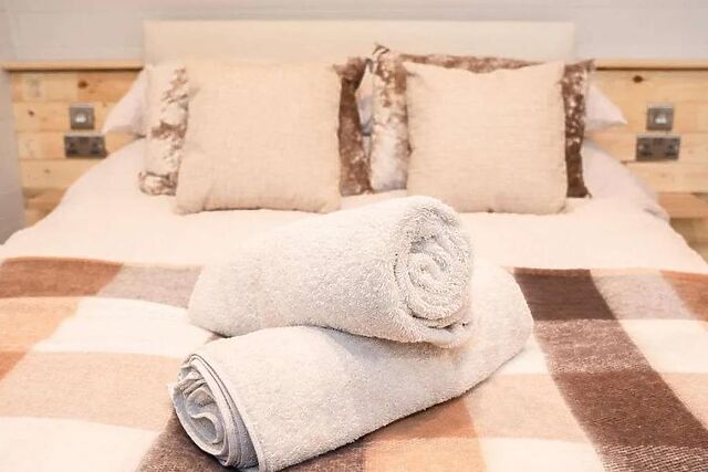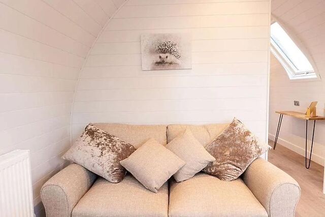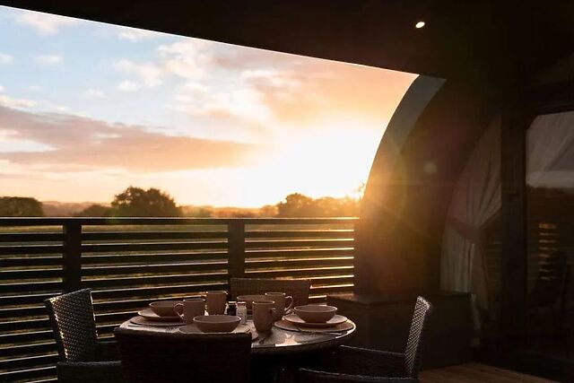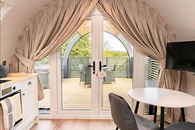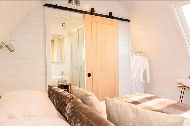 The table and chairs sit beside the natural light of the French doors, or you can take your meals outside for an al fresco experience. The double bedroom sits at the end of the pod and enjoys luxurious bedding, stylish decor and access to an en-suite shower room.