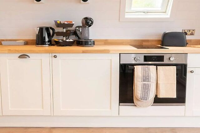 Step inside your beautifully designed accommodation, where high-end finishes and natural palettes meet rustic charm. In this open-plan layout, a plush sofa with a Smart TV promises cosy nights in the countryside, while the well-equipped kitchenette has everything you need to make dining a breeze, including a dishwasher and coffee machine.