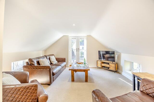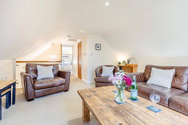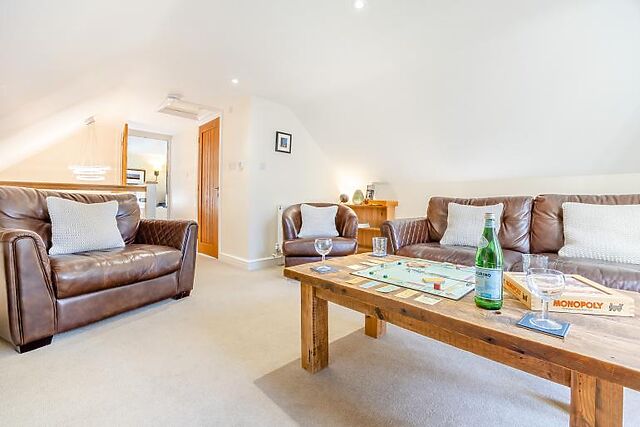 Upstairs, the spacious lounge beckons you to snuggle down and enjoy your favourite shows on the Smart TV, while the delightful Juliette balcony offers breathtaking views of the gently flowing stream. The upper floor also features a second bedroom with a double and single bed, providing a comfortable and restful space for guests, as well as a family bathroom complete with a bath and overhead shower for ultimate convenience.