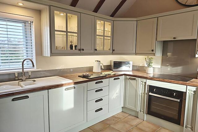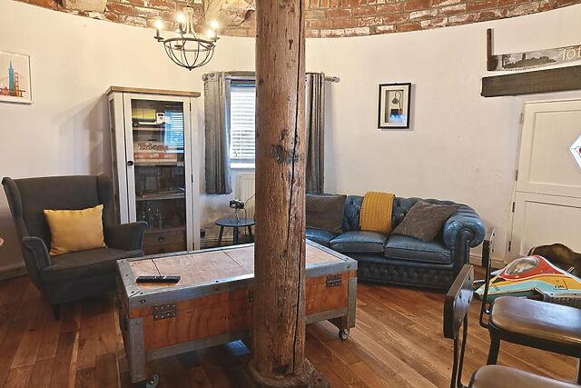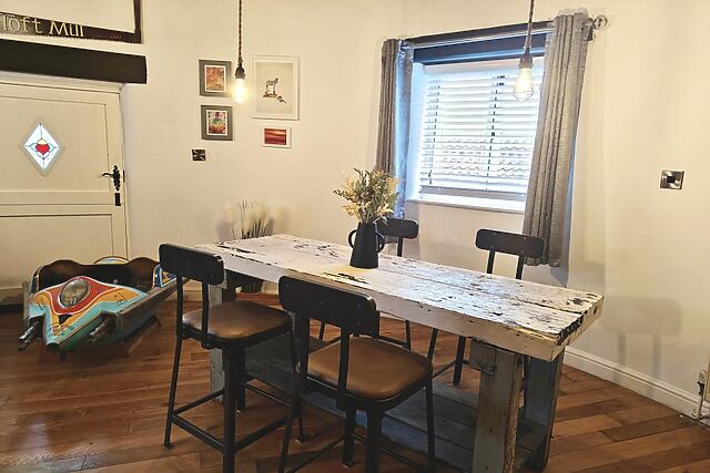 Upon entering this unique windmill holiday home via some steps, you will be greeted by the whitewashed kitchen, where characterful beams sit overhead, and modern appliances make cooking a stress-free experience, including an electric oven, hob, and washer/dryer. Carry plates through to the lounge/diner and enjoy tucking in around the upcycled table.