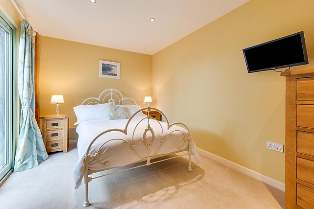 The comfortable sofas are the perfect place to unwind with a book or to watch a film on the smart TV, and the kitchen has an electric oven and hob, fridge with ice box and microwave, so you can prepare meals to share around the family dining table. Down the hall there are two bedrooms, one double with TV and patio doors leading outside, and one twin.