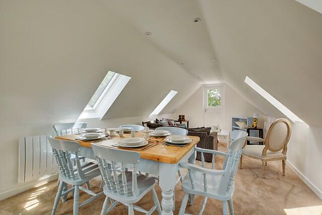 Climb the spiral staircase or the exterior set of stairs and discover a generously-sized open-plan space encompassing the entire first floor. The well-equipped kitchen awaits your culinary skills, with meals enjoyed around the dining table set against panoramic views of the surrounding countryside.