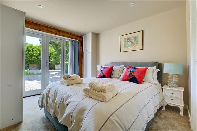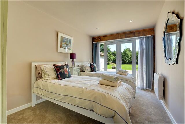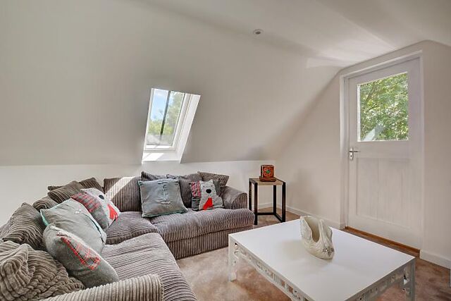 To one side, a cosy snug awaits with comfortable sofas, a TV, and patio doors that open onto the garden. On the ground floor, you'll find two bedrooms, each with patio doors.