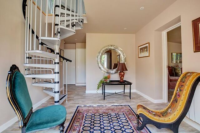 Located in a quiet complex, this delightful cottage offers a tranquil countryside retreat for couples or a family and comes complete with shared access to the owner's bubbling hot tub and its own private garden for al fresco dining. Enter through the double doors, and you'll be greeted by a stylish hall featuring a spiral staircase that leads upstairs.
