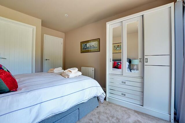 The first bedroom boasts a king-size bed with an en-suite shower room, while the second bedroom is home to twin beds. A gleaming bathroom completes the ground floor.