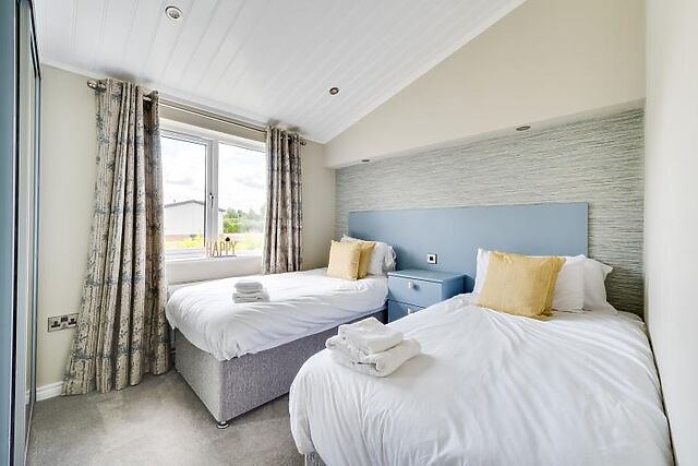 The master bedroom features a double bed, Smart TV, and an en-suite shower room. The second bedroom also has a double bed and Smart TV, while the third bedroom is ideal for children with its twin beds.