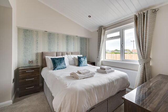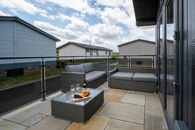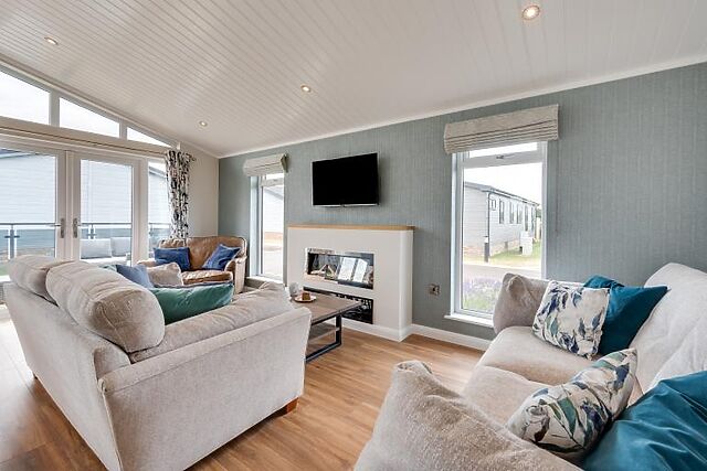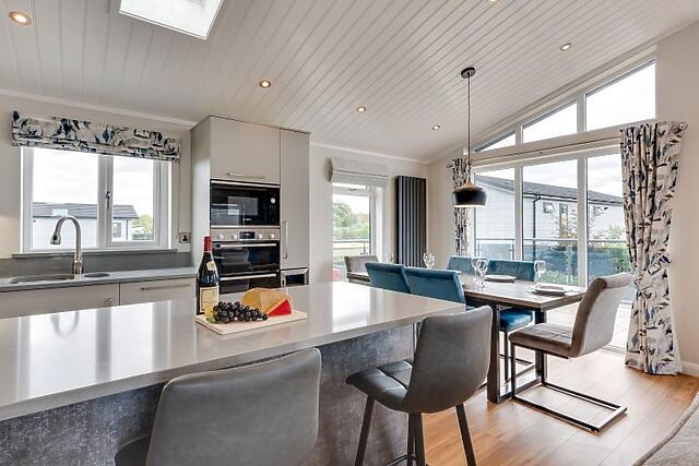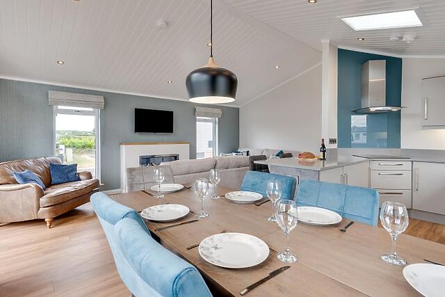 Step inside to find a bright and airy open-plan living, dining, and kitchen area. The modern kitchen features a breakfast bar, double oven, microwave, and a wine cooler, perfect for preparing and enjoying meals together. The living area boasts two plush sofas, an armchair, and a Smart TV, making it an ideal spot to unwind after a day of exploring.