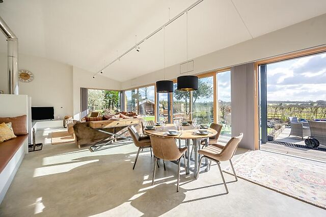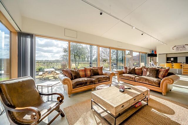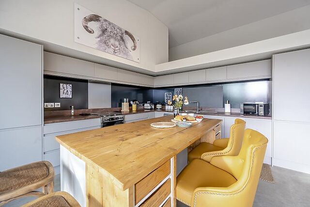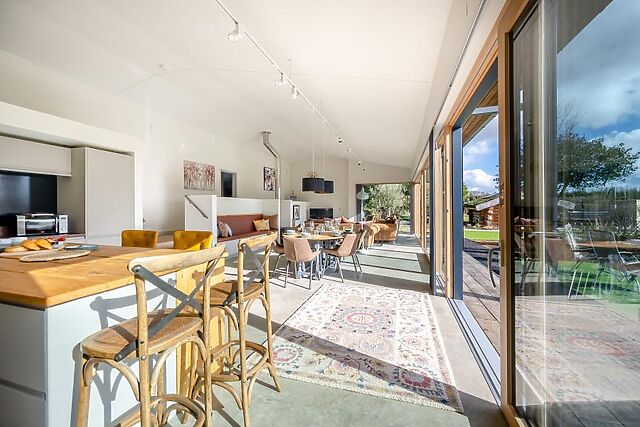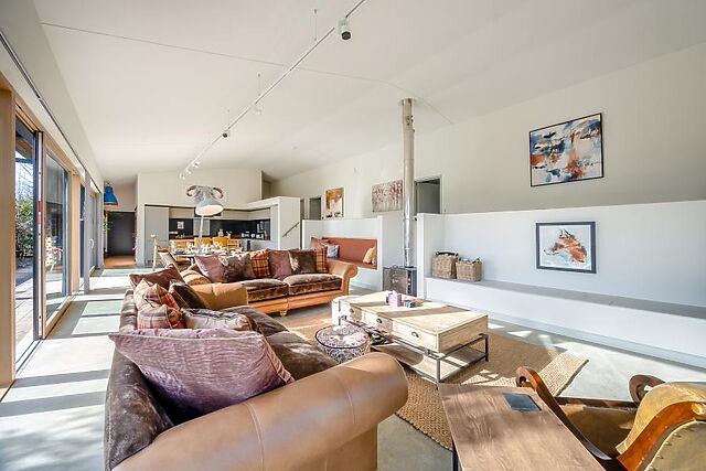 Down the hallway, there is an impressive open-plan living area, complete with floor-to-ceiling windows. Snuggle on the sofa and catch up on your favourite boxset on the Smart TV while you warm your toes in front of the crackling wood burner.