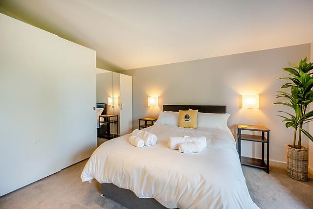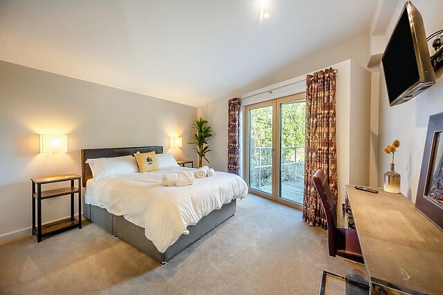 The property benefits from three bedrooms: two king-size rooms with Smart TVs and one boasting access to a scenic, raised terrace and an elegant en-suite bathroom with a free-standing roll-top bath, shower and WC. The third bedroom features an en-suite shower room and a flexible super-king-size room with zip-and-link beds that convert to twins on request.