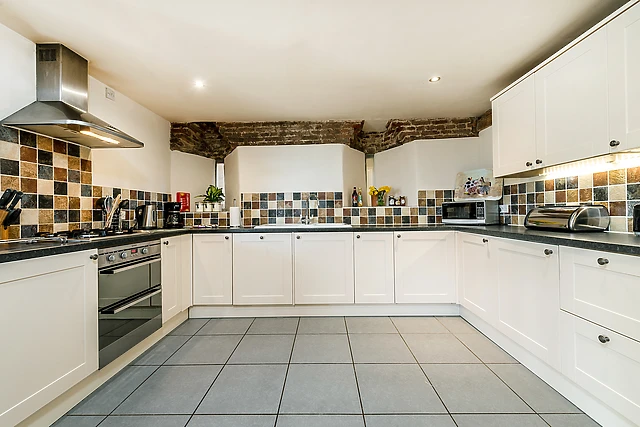 the sitting area offers two three-seater sofas, Smart TV and french doors opening out onto the garden. The kitchen is well equipped with everything you need to cook up a storm, including a double oven with four ring gas hob, fridge, freezer, dishwasher, washing machine (with line drying facilities), microwave, filter coffee machine, kettle and toaster.