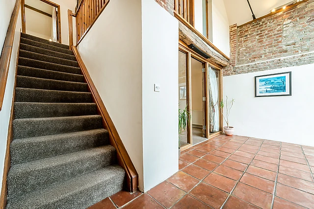 First Floor Carpeted stairs with hand rail lead up to the first floor landing area. Bedroom 1 With a beautiful exposed brick wall, featuring a king size bed with bedside tables and lamps, fitted wardrobe, dressing table with mirror and stool.