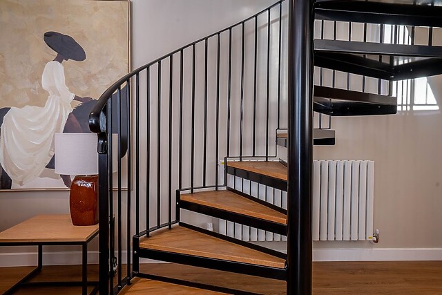 Relax in the sitting area, where you can unwind in front of the Smart TV as the evenings grow darker. Venture up the centre-piece spiral staircase to find two beautifully-presented bedrooms, each boasting its own Smart TV and flooded with natural light from Velux windows.