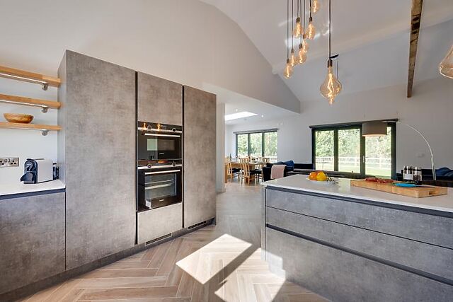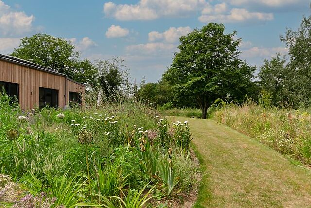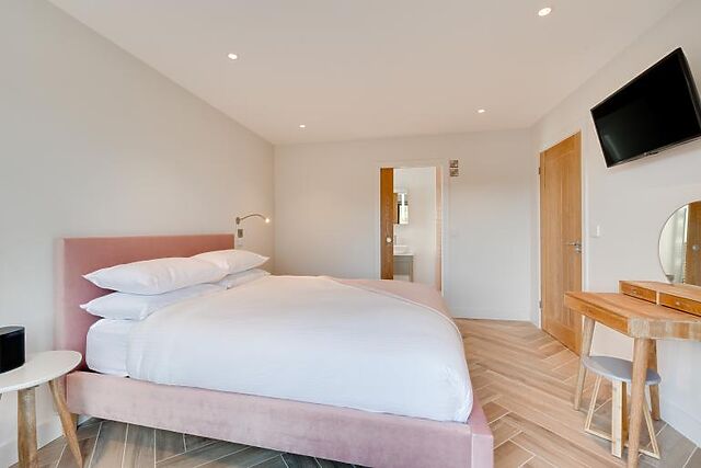 The barn features four spacious bedrooms, including two en-suite king-size rooms and two king-size zip-and-link rooms that can be made into twins upon request. Large picture windows in each bedroom offer lovely views of the garden, and a family bathroom completes the interior.