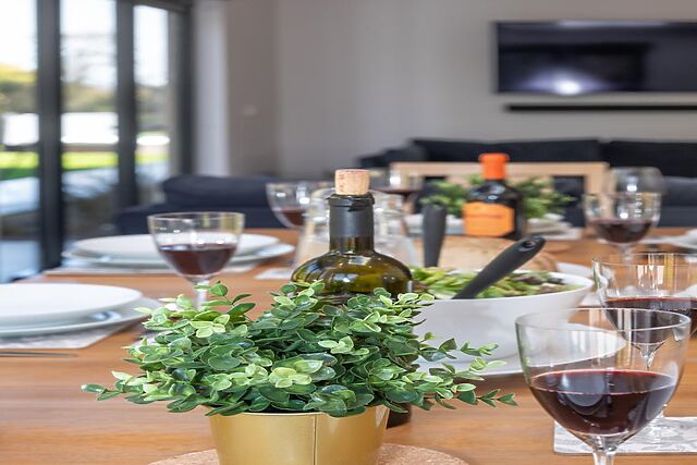 The contemporary kitchen is well-equipped, and the living space is made cosy with three comfy sofas and a Smart TV with a surround sound system.