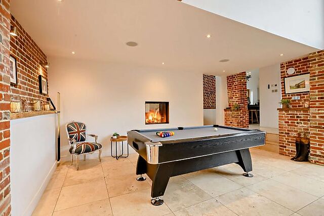The open-plan kitchen, dining, and games room with a pool table create a welcoming space for socialising.