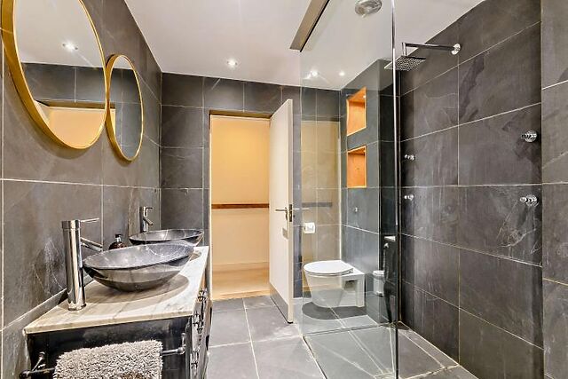 These share a Jack-and-Jill shower room. Upstairs, the master bedroom features a king-size bed and en-suite bathroom, while the second bedroom has a double bed and en-suite shower room.
