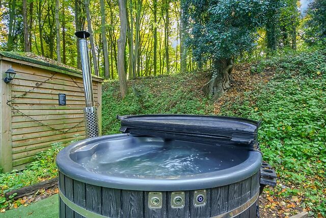 Enjoy evenings around the fire pit, cooking on the BBQ grill, or soaking in the six-person wood-fired hot tub with jets and lights. The covered gazebo provides additional seating, and the surrounding woodland offers endless opportunities for exploration, den-building, and adventure.