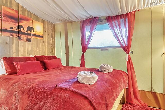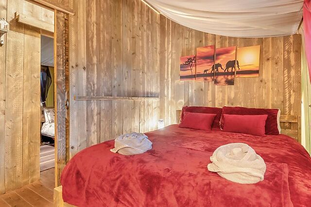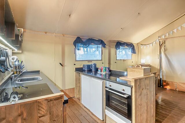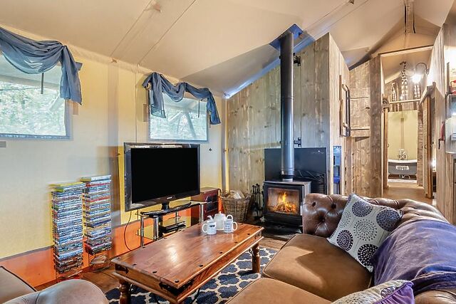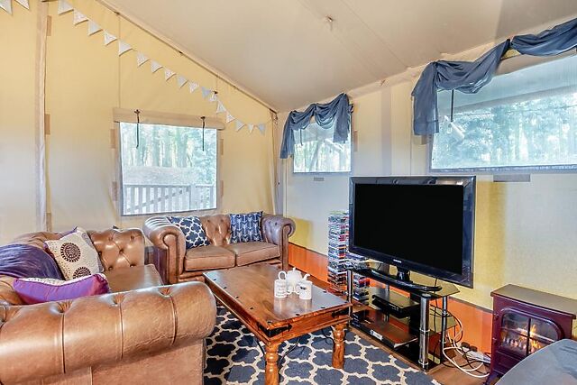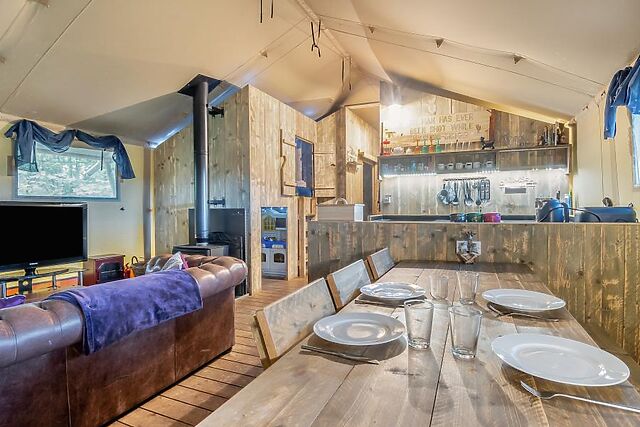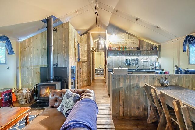 Perfect for families, the tent features a cosy children’s den with toys and a secret play area, a spacious lounge with a wood burner and TV, and a fully equipped kitchen and dining area for reconnecting over meals. The lare bathroom boasts a free-standing bath, a flushing toilet, and a heated towel rail, while outside, the private decked area invites you to relax under the stars.