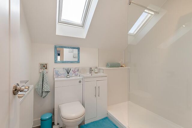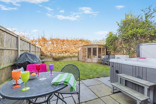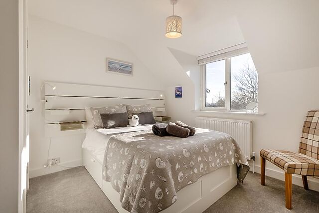 French doors lead to the garden and hot tub. Upstairs, you’ll find the bedrooms: the master king-size with an en-suite shower room, a double under the eaves, and a third bedroom, which features a single trundle bed, which can be made up into two singles or a king-size on request.