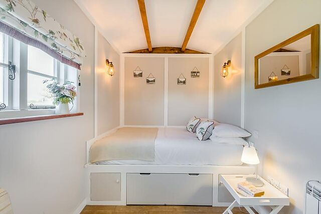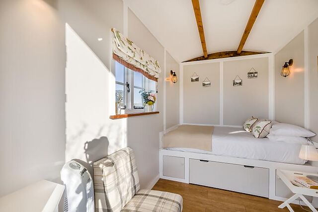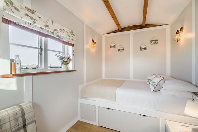 For culture, shopping and history, Norwich (17 miles) boast medieval streets, a magnificent cathedral and plenty of family-friendly attractions. Step inside the hut to find a snug yet cleverly designed space, complete with a comfortable double bed, bedside table and chair, plus ample storage, including hanging for clothes.