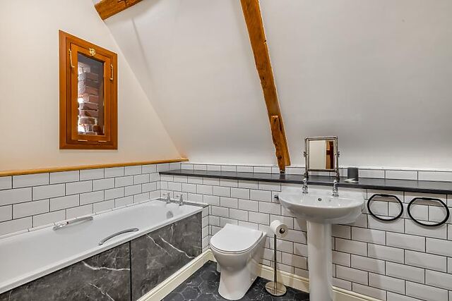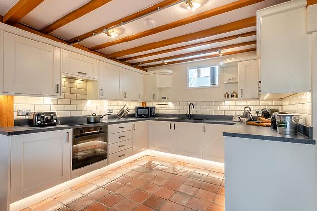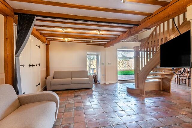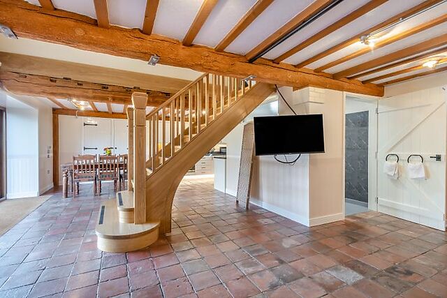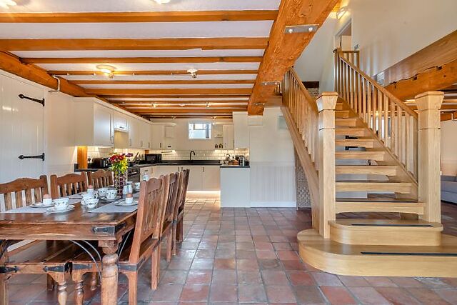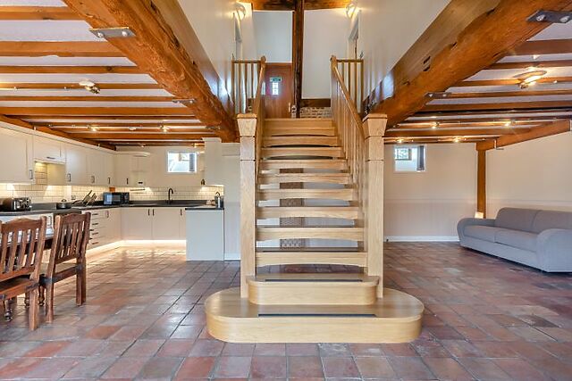 Set beneath high ceilings and wooden beams, you can cook a storm in the practical country-style kitchen and eat together at the dining table. To the other side of the staircase, you will find two comfortable sofas where you can curl up and unwind in front of the Smart TV.
