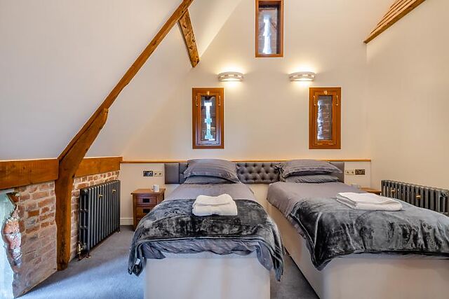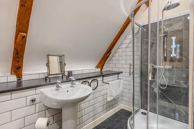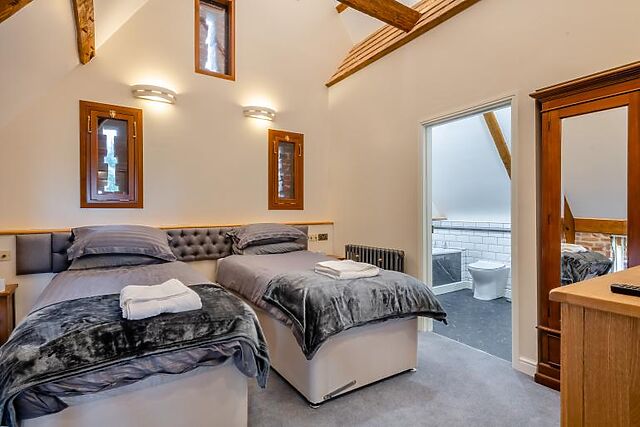 Completing the ground floor is a wet room. As night draws in, climb the stairs and find the two welcoming king-size bedrooms (one of which can be made into 2’6†twin beds on request at time of booking), both with en-suite bathrooms.