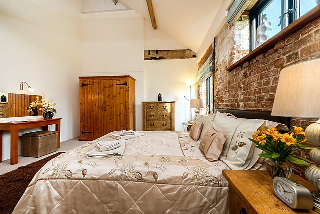 Bedroom 1 A sumptuous bedroom awaits, with exposed brick wall, vaulted ceiling and beautiful oak beams. This room has a king size bed with bedside tables and lamps.