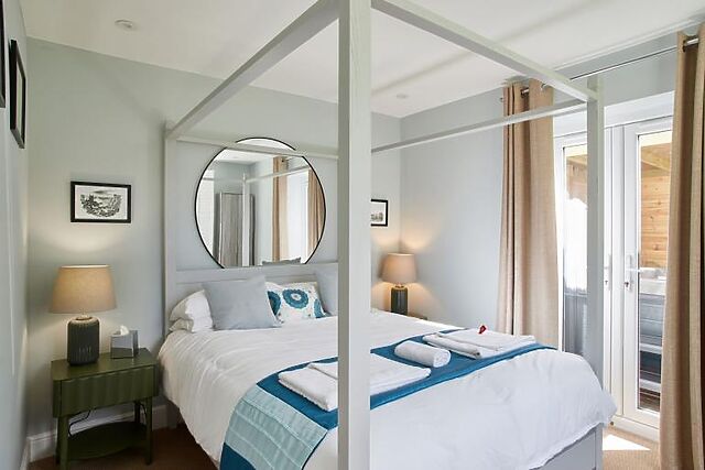 The accommodation features a stylish bedroom with a four-poster king-size bed, adding a touch of elegance to your stay.