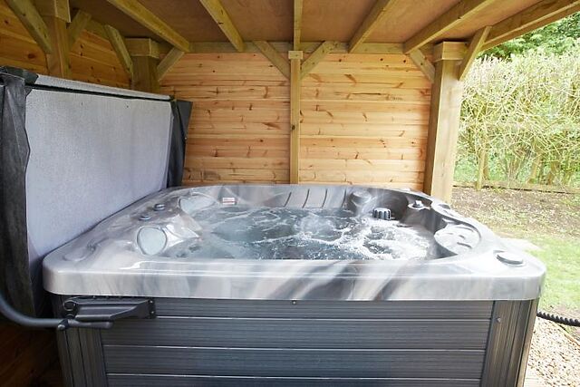French doors from the bedroom lead out to a private patio area where you can relax in the hot tub, surrounded by the tranquillity of the woodland setting. The walk-in shower room with a WC is designed for convenience and style, featuring modern fixtures and a spacious layout.