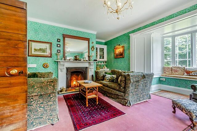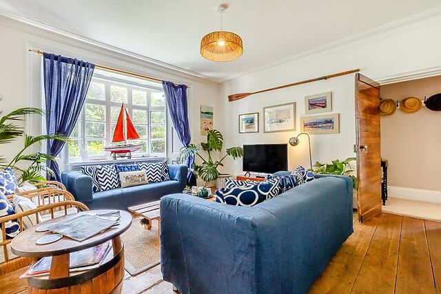 Inside, you’ll find a well-equipped kitchen featuring an Aga, a spacious dining area with bi-fold doors, and a lounge furnished in a beach house style. The drawing room, with its open marble fireplace and log fire, offers a cosy spot to relax.