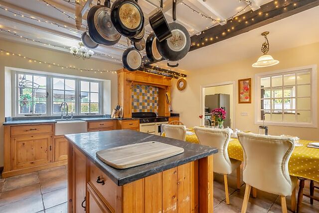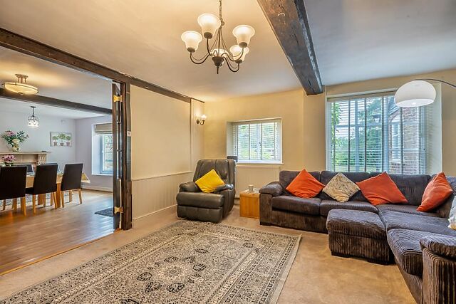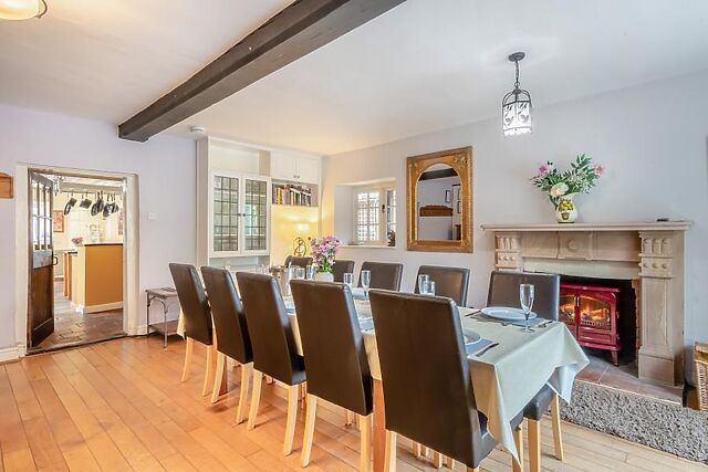 At the heart of the home is the farmhouse kitchen/diner, boasting flagstone flooring, plenty of worktop space, a dining table and, just off the kitchen, a handy utility room. The separate dining room has a formal, banquet-style dining table and a cosy wood burner-effect electric fire.