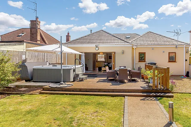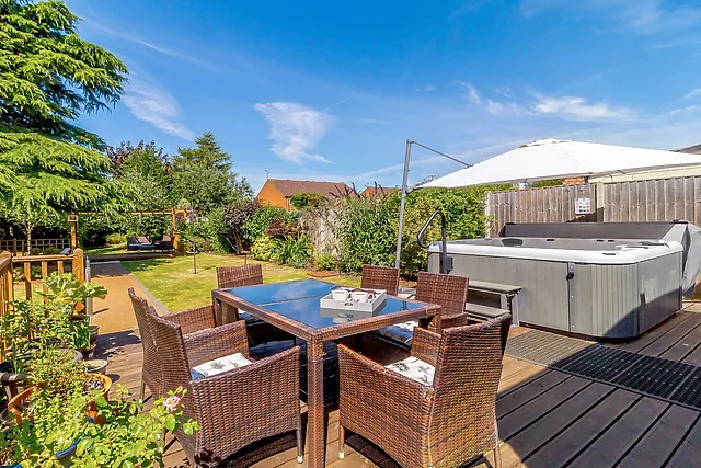 The open-plan living space, complete with bi-fold doors, opens onto a beautiful garden and decking area, where you can unwind in the private hot tub.