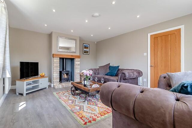 Inside, you'll find a cosy lounge with large, comfy sofas and a wood burner, perfect for unwinding after a day of exploration. The well-equipped kitchen allows you to prepare home-cooked meals, which you can enjoy at the breakfast bar.