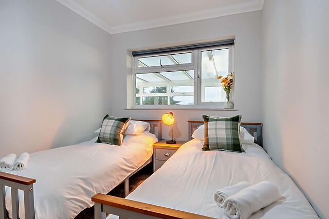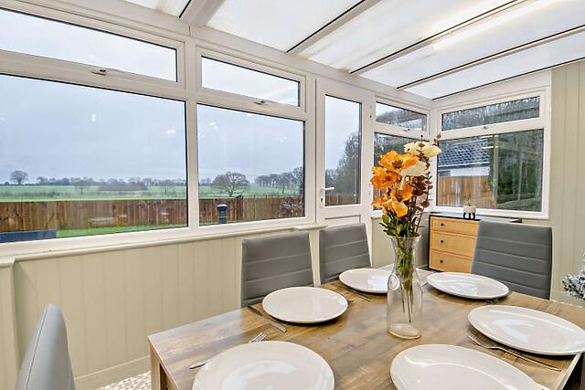 The main house features a spacious living area with a wood burner, perfect for those chilly evenings. The well-equipped kitchen and dining area overlook the garden and surrounding fields, offering a serene dining experience.