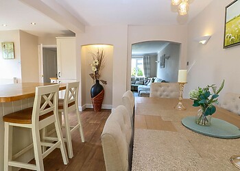 The spacious kitchen is well-equipped with modern appliances, making it perfect for a self-catering holiday.