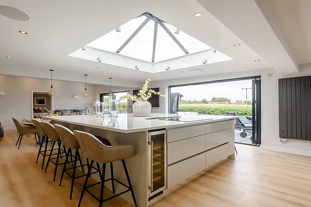 Inside, you'll find a beautifully designed open-plan living space, complete with a bespoke central island and a sky light that allows you to stargaze. The property also offers a dedicated sauna room and a cinema room with a screen and audio system, perfect for movie nights.