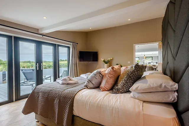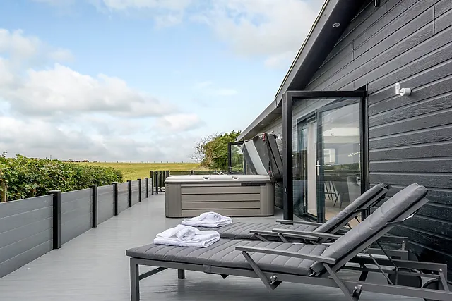 Outside, the private, enclosed decking area with a fire pit is ideal for al fresco dining, while the hot tub offers unspoilt views over the countryside.