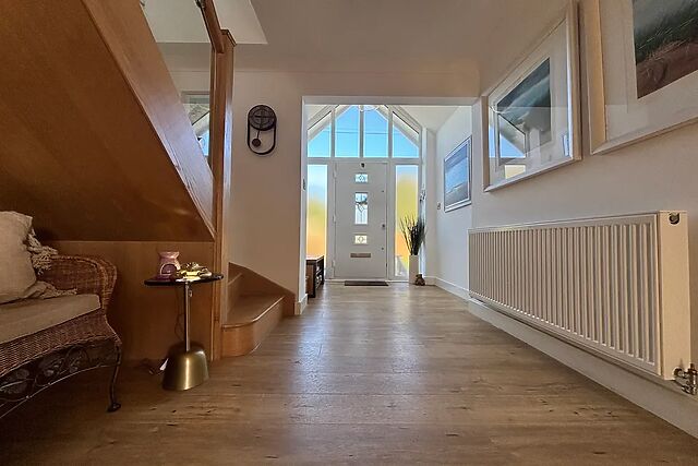 Step outside through the bi-folding doors to the enclosed rear gardens, a real highlight, with lawns and a patio area furnished for alfresco dining and lingering over drinks in the fresh sea air. Slip into the hot tub as dusk falls and savour an unhurried soak while you chat through plans for tomorrow.