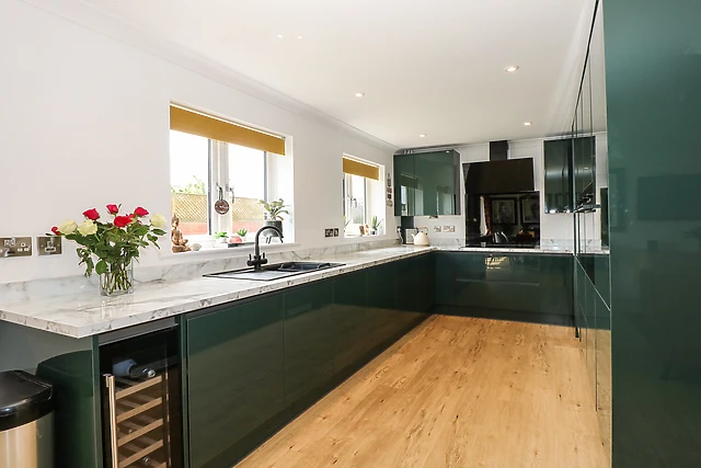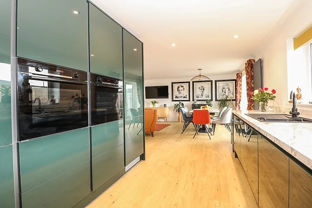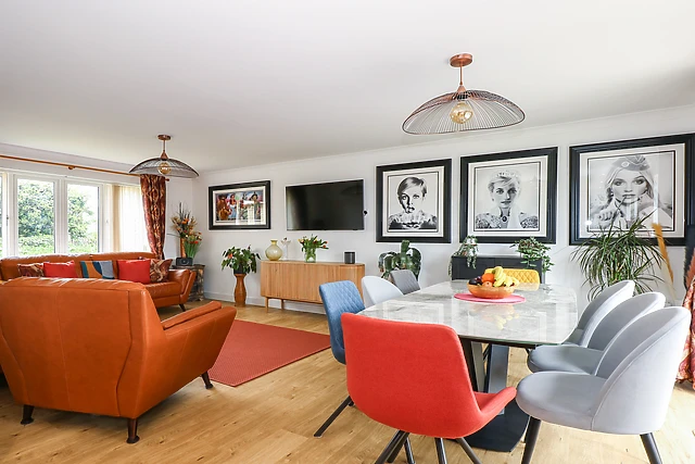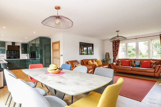 The kitchen has been immaculately transformed and contains all the necessary appliances for a self-catering stay, including a double electric oven, an induction hob, a microwave, and a dishwasher. The dining table, seating 10 guests, and the living space are perfect for socialising at the end of an exciting day.