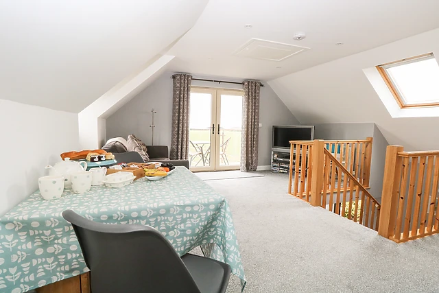 The ground floor houses a cosy double bedroom, ensuring a restful night's sleep, while the first-floor open-plan living space boasts stunning views and a balcony to admire the Norfolk countryside and distant sea vistas.