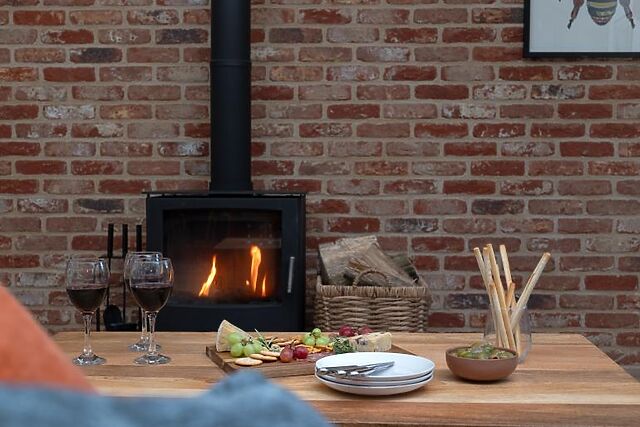 The living room offers comfortable seating, a Smart TV, and a wood-burning stove for cosy evenings. The well-equipped kitchen is a chef’s dream, complete with modern appliances and a large dining table for communal meals.