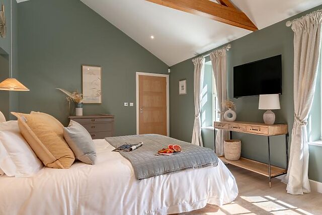 The barn boasts four luxurious bedrooms, each with a Smart TV.