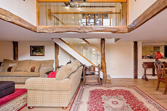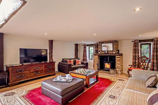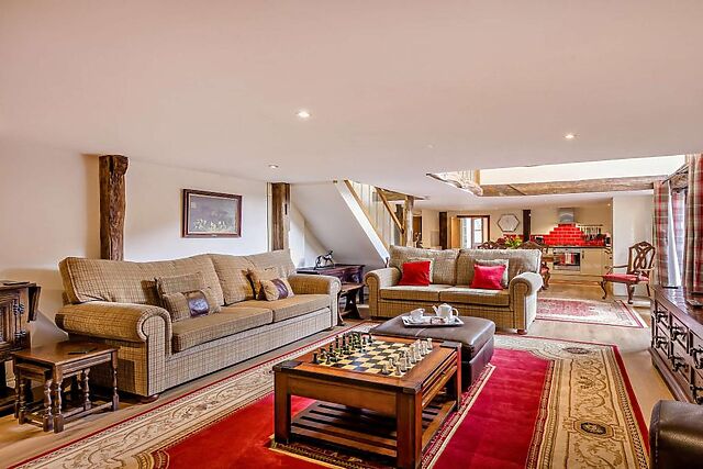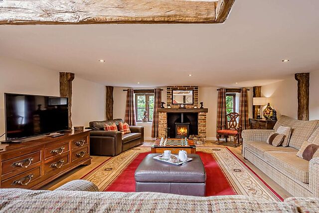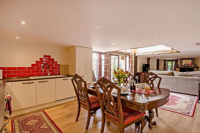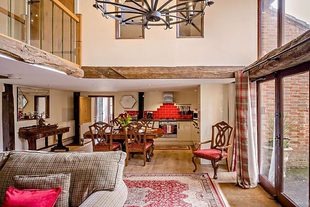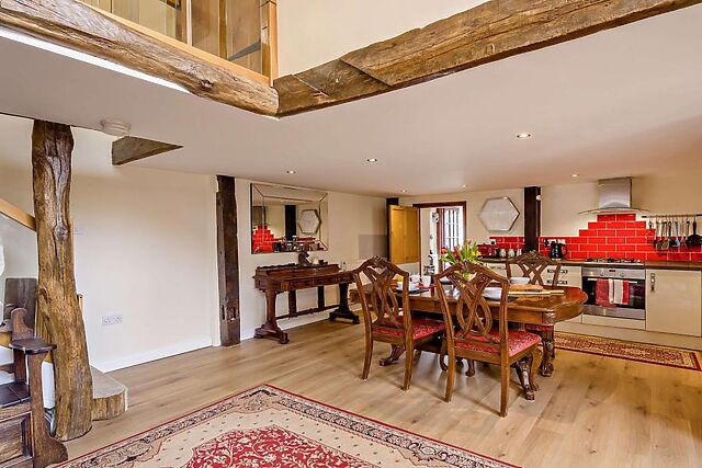 Walk into this beautifully converted barn and into the open-plan lounge/kitchen/diner. This characterful room, with vaulted ceilings and exposed oak columns, is welcoming and offers a peaceful spot to curl up beside the wood burner and watch a film.