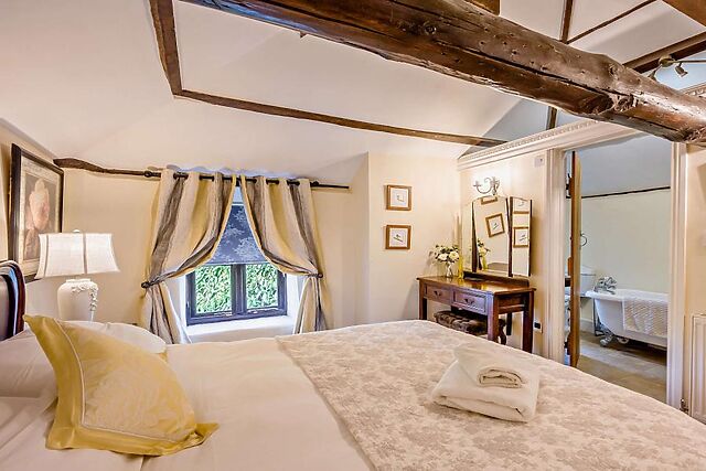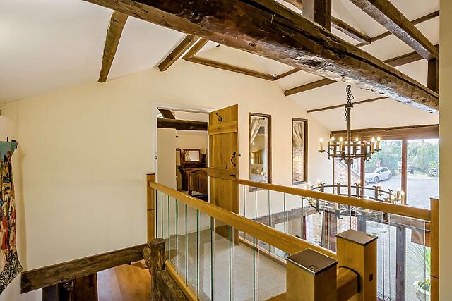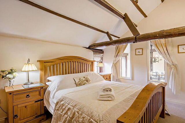 As you ascend the staircase to the first floor, you’ll discover a king-size bedroom and a super-king-size bedroom. Both bedrooms feature charming overhead beams, stunning vaulted ceilings, and en-suite bathrooms with a bath, shower, and WC.