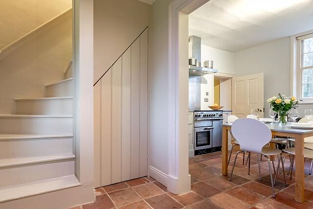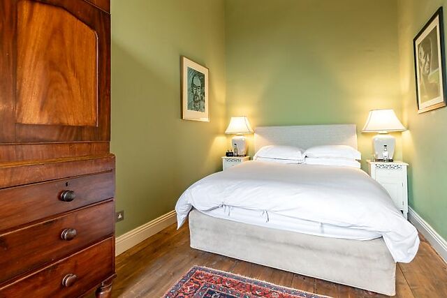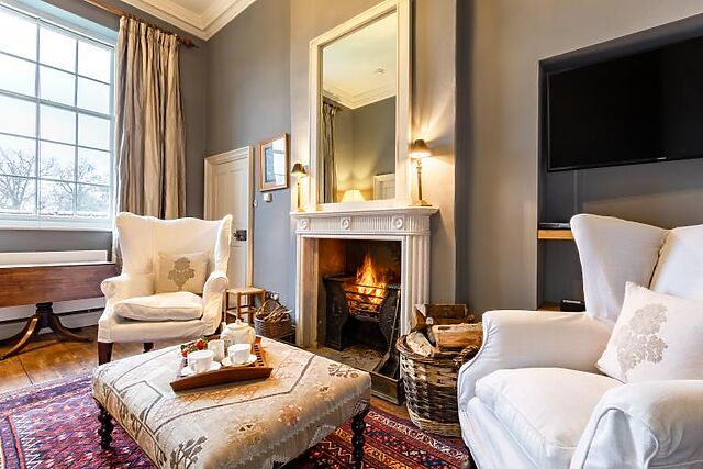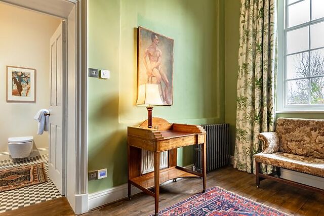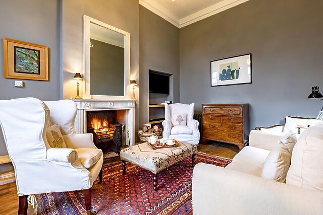 The sitting room, with its open fire, provides a cosy space to relax. The third bedroom, located upstairs, boasts stunning views over the estate's walled garden.