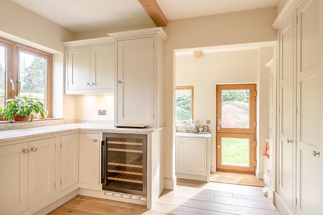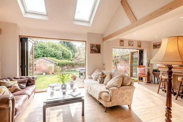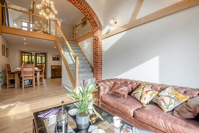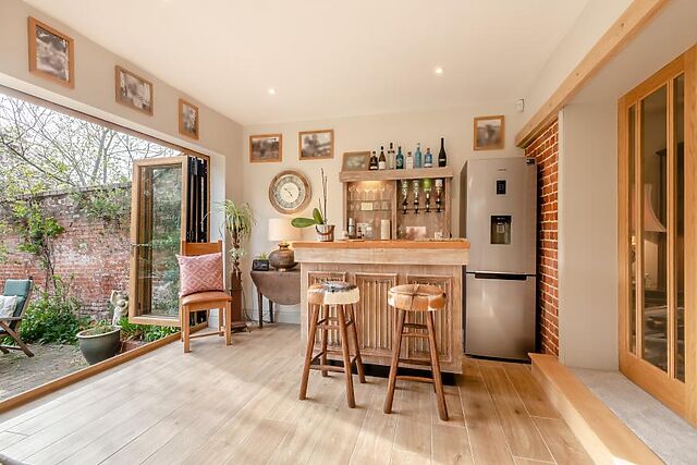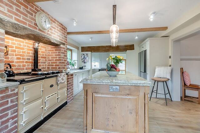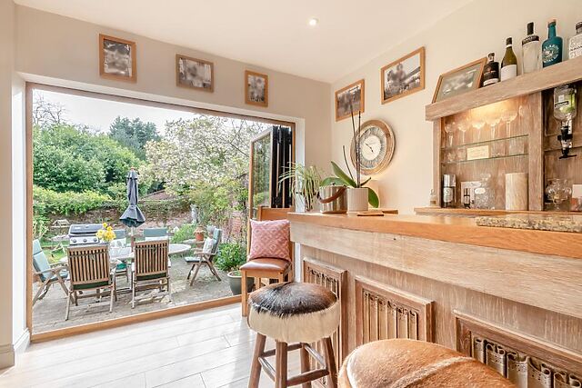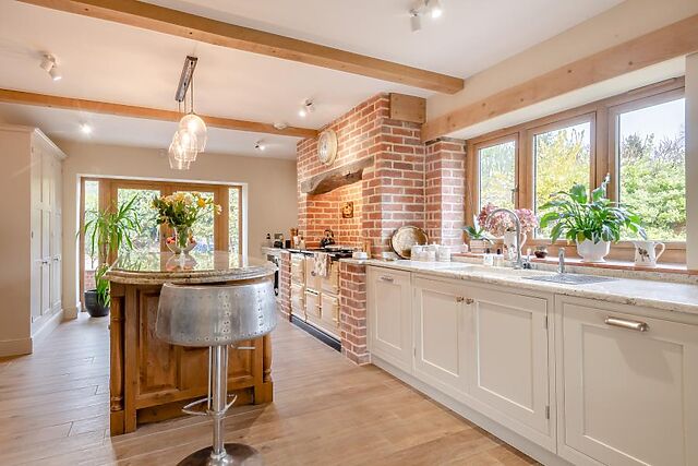 An entrance hallway leads to the light-filled kitchen, with lovely exposed beams, brickwork, and a central island, plus a beautiful adjoining sunroom with bar area and garden views. An archway leads into an inviting dining room/gallery, where you’ll find a lovely dining table.