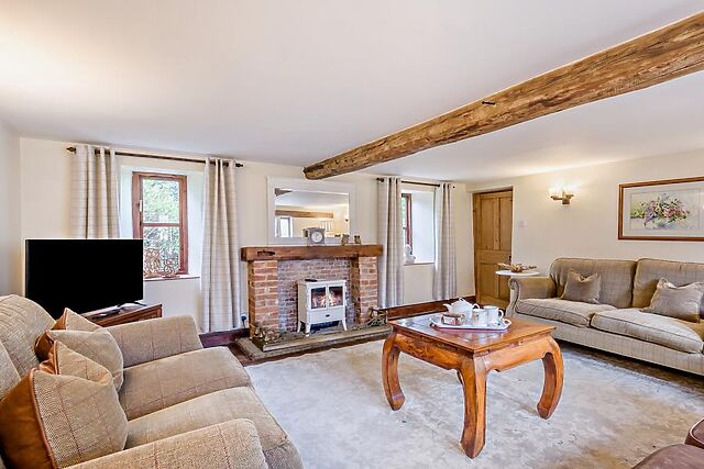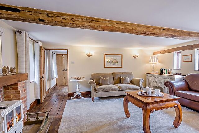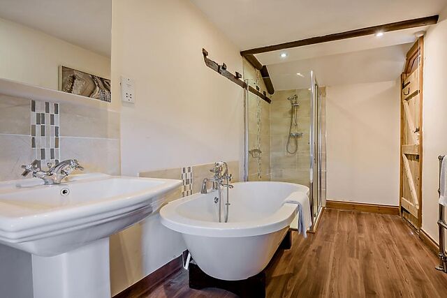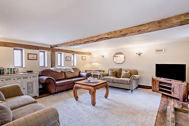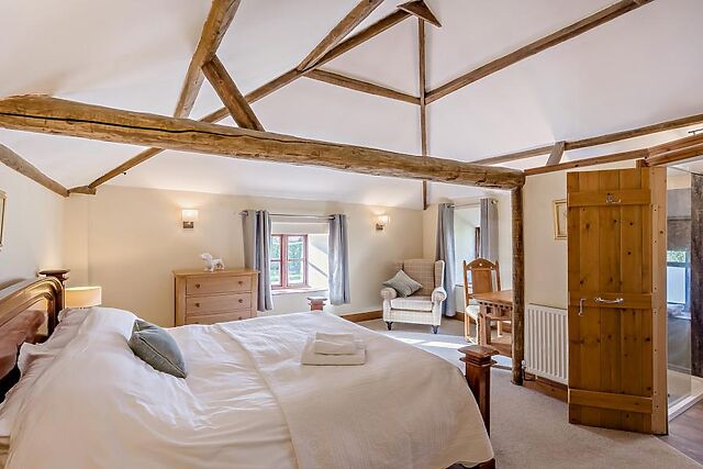 Upstairs, two thoughtfully presented bedrooms await: a super-king-size with en-suite shower room and WC and a super-king-size zip-and-link. Look up, and you’ll spot exposed beams and a soaring vaulted ceiling that instantly makes the space feel special.