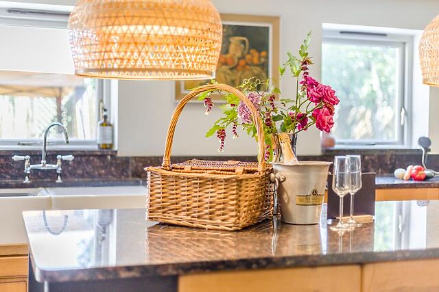 The stylish kitchen is fitted with modern appliances to make cooking for 17 a breeze, with a central island and breakfast stools for casual dining. A more formal dining room sits just along the hall, perfect for celebratory feasts.